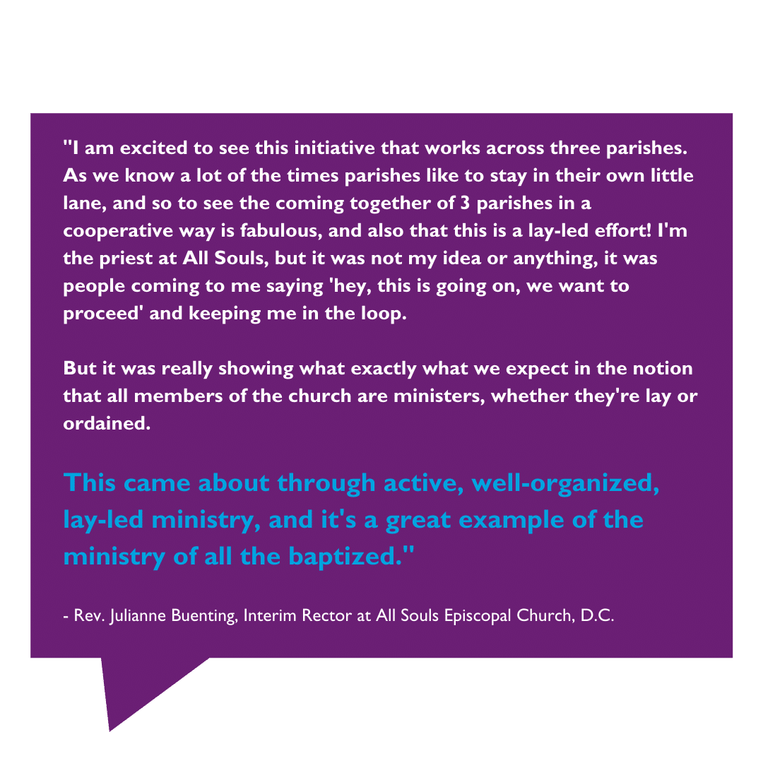 “I am excited to see this initiative that works across three parishes. As we know, a lot of the times parishes like to stay in their own little lane, and so to see the coming together of three parishes in a cooperative way is fabulous, and also that this is a lay-led effort! I’m the priest at All Souls, but it was not my idea or anything, it was people coming to me saying ‘hey, this is going on, we want to proceed’ and keeping me in the loop. But it was really showing what exactly we expect in the notion that all members of the church are ministers, whether they’re lay or ordained. This came about through active, well-organized, lay-led ministry, and it’s a great example of the ministry of all the baptized.”
