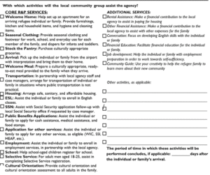 Faced with a wide spectrum of practices, policy leaders at the Department of State’s Bureau of Population, Refugees and Migration (PRM) have pushed in recent years for a standardization of expectations about the role that community sponsors will play in resettlement. Thus, as it now stands, resettlement agencies and their affiliates who receive federal funding may recognize as “community sponsors” any established group that commits to providing or ensuring at least 8 of the core services required under the Reception and Placement program.