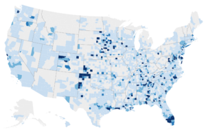 Dreier’s December 28, 2023 piece includes this map based on HHS data. It shows where migrant children have been placed with non-family sponsors. Darker spots indicate a greater density of such placements, with the greater risk of exploitation by both sponsors and employers.