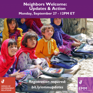 Join Episcopal Migration Ministries and The Episcopal Church’s Office of Government Relations (OGR) on September 27 at 12pm ET for an update on Afghan evacuations, arrivals, and ways you can take action to welcome your newest neighbors. In addition to status updates on this emerging situation, you will also hear updates on EMM’s ongoing ministry of welcome to refugees and asylum seekers, as well as updates from OGR on movements in Congress.