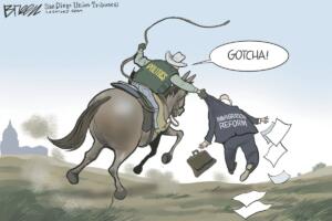 The slow progress reflects the lasting impact of the Covid-19 pandemic and the loss of bipartisan support for refugee resettlement, as discussions of migration and immigration have become increasingly polarized — as captured in this cartoon by Steve Breen.