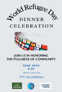 One more notable event — in honor of World Refugee Day on June 20 — was a dinner and discussion co-hosted by Home is Here NOLA, the St. Charles Center for Faith + Action, and the World Affairs Council of New Orleans. This event brought together people involved in the sponsoring organizations and allied groups, including Randy and KB Lovejoy representing RISA-NOLA. After sharing a meal, attendees engaged in guided discussions at their tables. Questions provided by the hosts invited people to talk about their personal experiences of moving or migrating, adapting to change, and engaging in community work. KB and Randy found the questions very helpful to “creating common ground” among participants, some of whom had experienced forced migration.