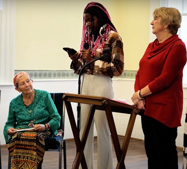 In December 2023, the teenaged daughter of the Colombian family shared part of her family’s story at an event organized by the First Presbyterian Church. By that point, she had been in high school for a semester, and her English was even stronger. The main event was an opportunity for Lilly Krcmar, a former refugee from Suriname who has lived in New Bern for many years, and is an active volunteer with IRM, to share her story with the community. Invited to come up, and standing between the elderly Mrs. Krcmar and facilitator Helen Robinson, the young Colombian woman, Sharon, shared some comments she had prepared on her phone.