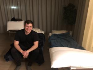 Micah French ready to spend the night at Serenissima with Ukrainian refugees